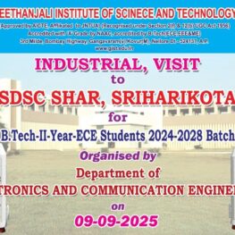 Department of Electronics & Communication Engineering organized an Industrial Visit to “Satish Dhawan Space Centre (SDSC) SHAR, Sriharikota” on 09-09-2025 for II ECE – A & B students. Total of 103 students along with 05 staff members attended the visit. SDSC SHAR is one of the primary spaceports of the Indian Space Research Organization (ISRO), responsible for launching India’s satellites into orbit using PSLV, GSLV, and other indigenous launch vehicles.